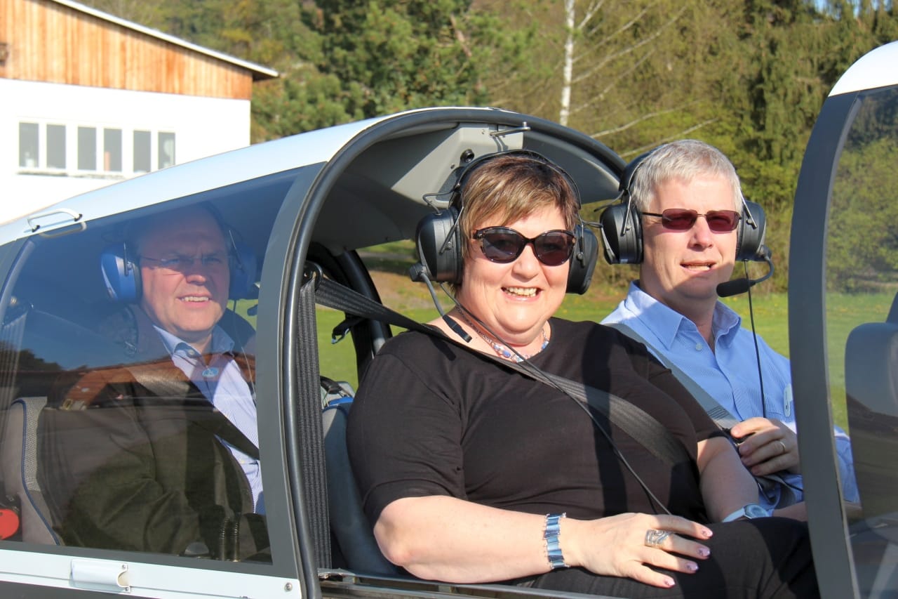 Landrätin Andrea Jochner-Weiß und ihr Stellvertreter Karl-Heinz Grehl beobachteten das gesamte Übungsgeschehen aus dem viersitzigen Reiseflugzeug vom Typ Regent mit LSV-Pilot Jan Berger.
